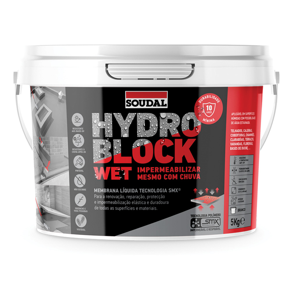 Hydro Block wet é um impermeabilizante elástico, sem solventes, com aderência na maioria das superficies verticais e horizontais, antigas ou humidas, sem necessidade de usar primário.